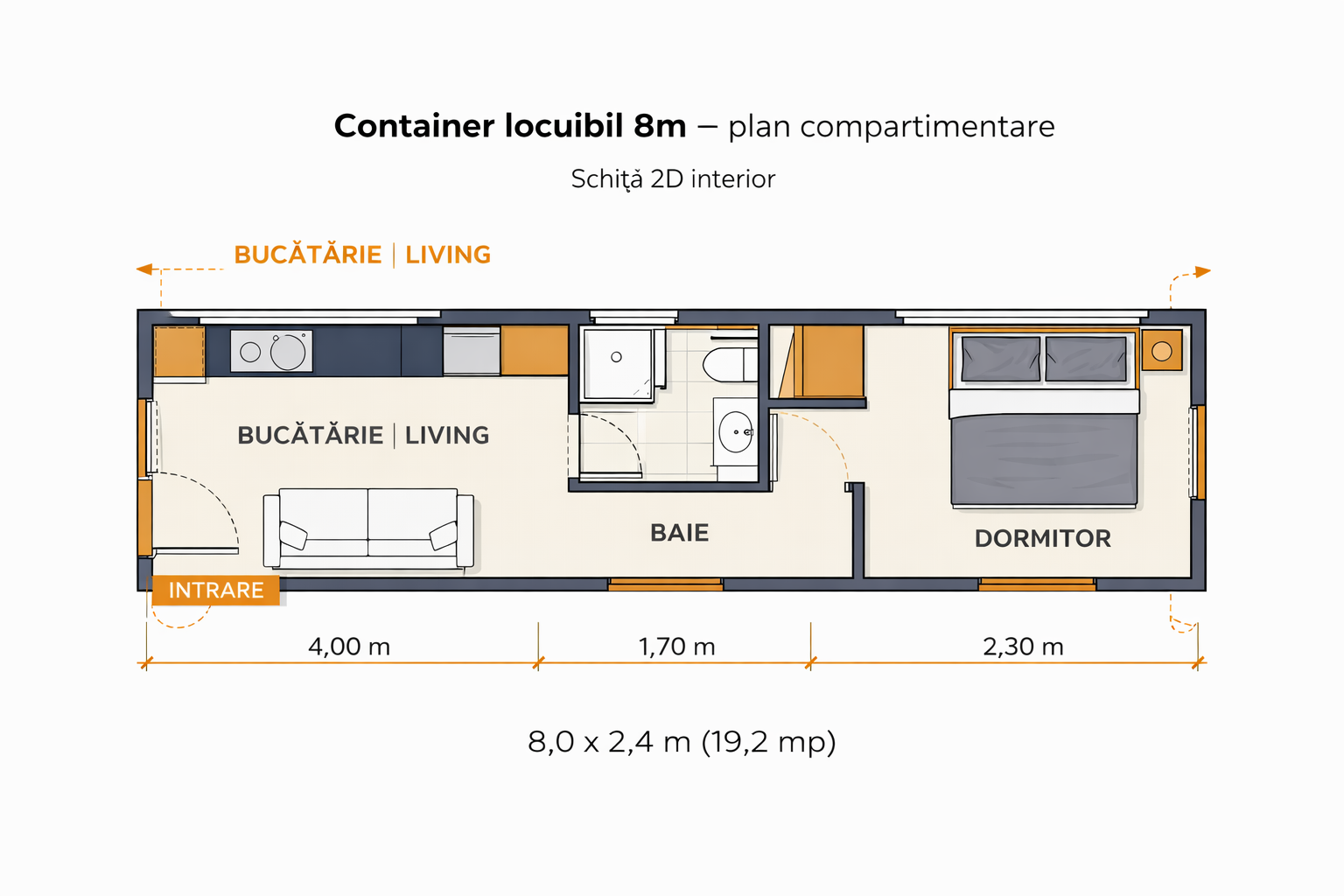 Aceste dimensiuni permit amenajarea unui container de locuit 8m complet funcțional, cu zonă de dormit, spațiu de depozitare, birou sau compartimentări interioare.