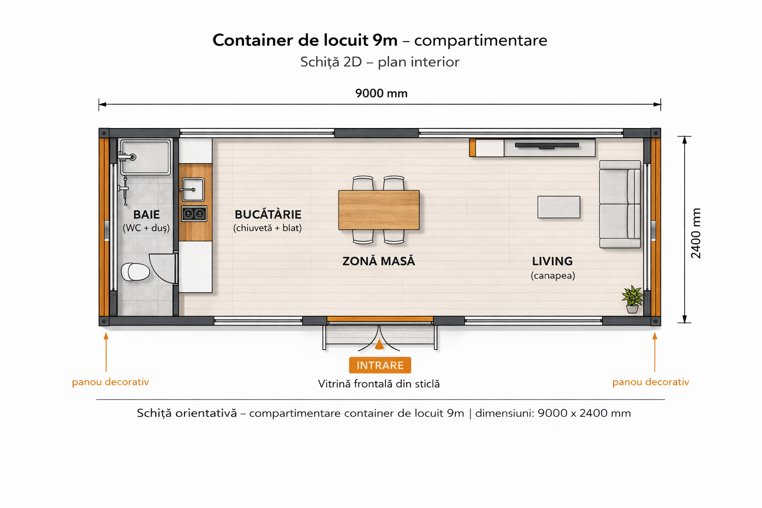 Containerul de locuit 9m este proiectat pentru a oferi un spațiu bine organizat și funcțional.
