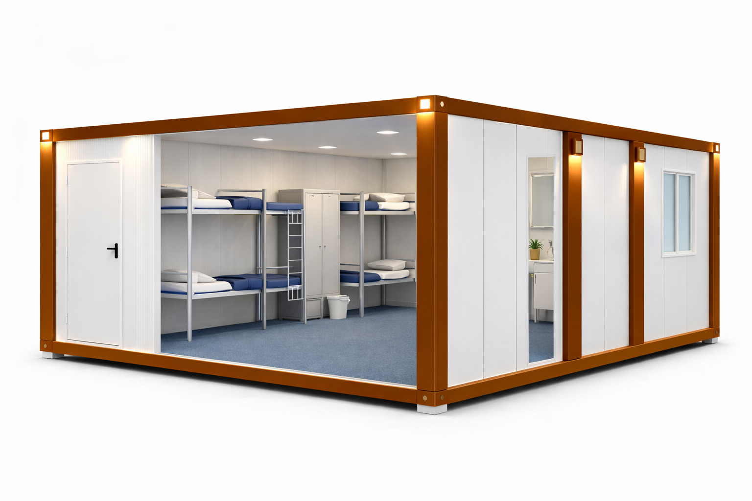 Pe lângă această configurație, realizăm și alte dimensiuni de containere modulare, precum 6×3 m, 6×4.8 m, 6×6 m sau 6×9.6 m, în funcție de necesitățile fiecărui proiect. Sistemul modular permite adaptarea completă a construcției.