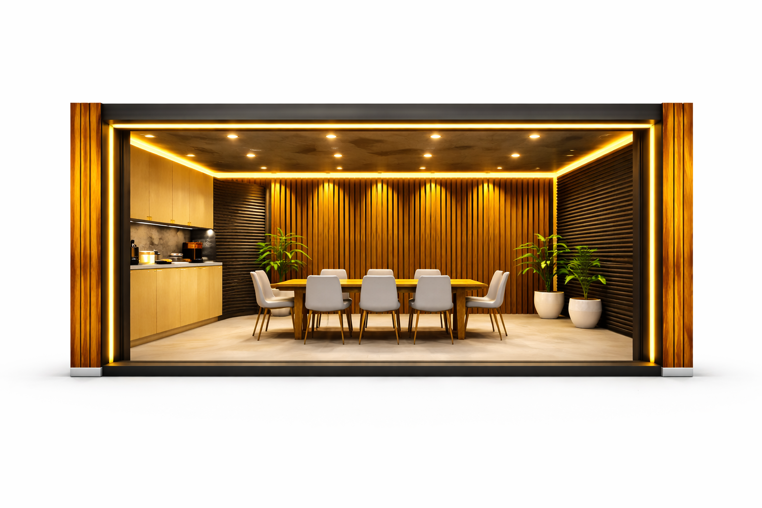Datorită dimensiunii sale, containerul terasă 6×6 m (format din 2 module 6×3 m) este potrivit pentru afaceri care au nevoie de spațiu extins. Poate fi utilizat pentru zone de servire, spații de lucru sau showroom-uri, oferind un mediu modern și funcțional.