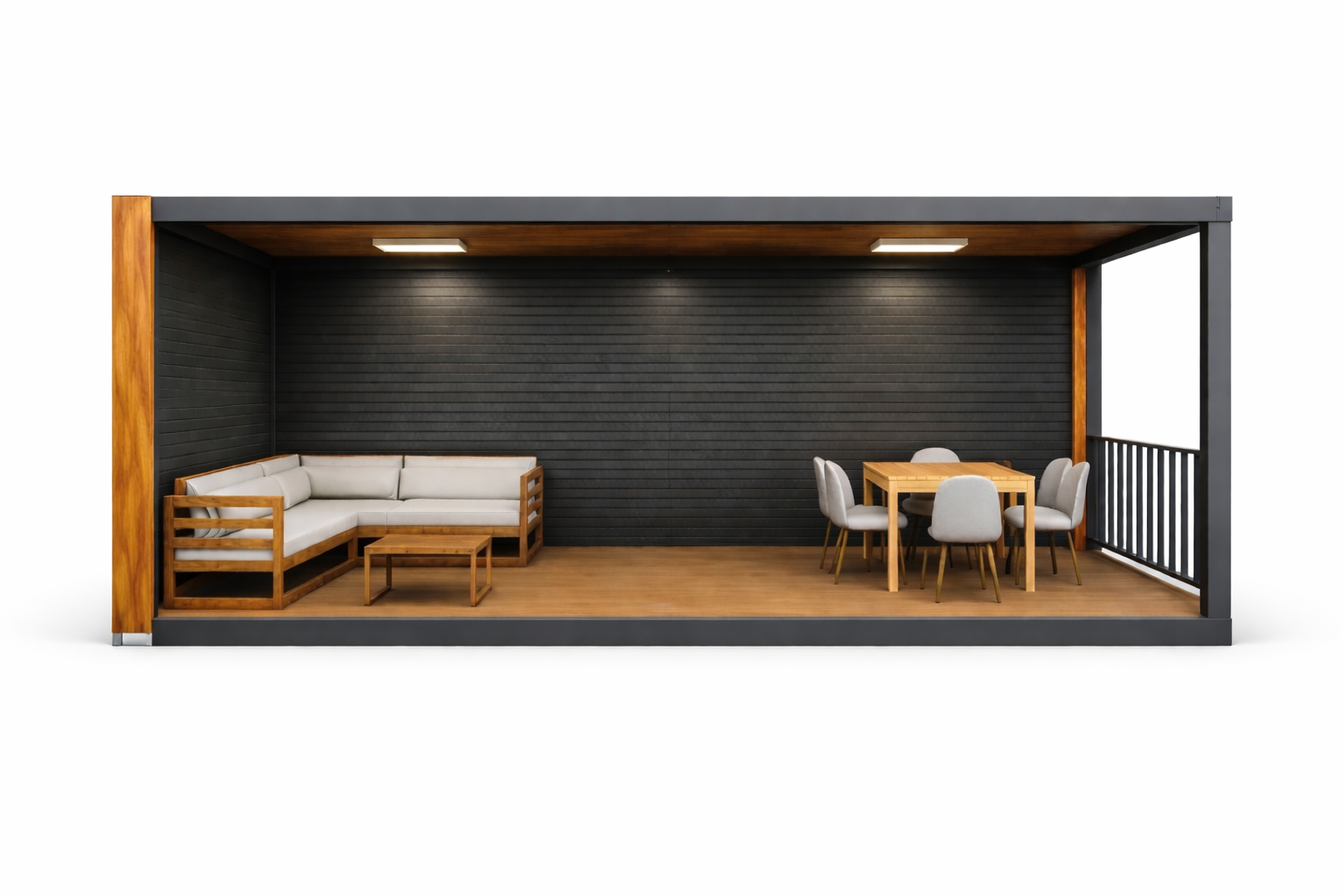 Container terasă 8000x3000x2700 foișor modular este o soluție modernă pentru amenajarea teraselor, grădinilor sau spațiilor comerciale. Construcția modulară oferă flexibilitate și poate fi personalizată în funcție de proiect, inclusiv dimensiuni și finisaje diferite.